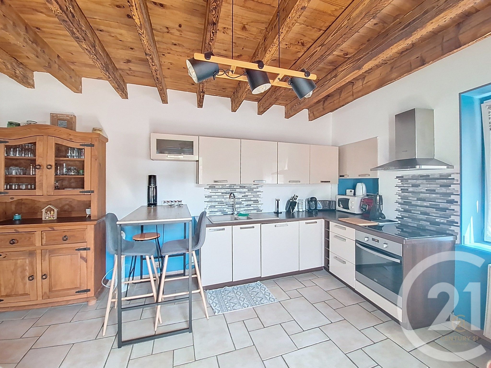 Dès l'entrée, vous serez séduit par le charme de la cuisine dinatoire avec plafonds à la française, idéale pour partager vos repas en famille.